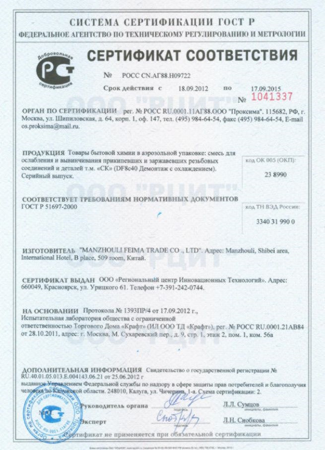 Сертификат соответствия на товары бытовой химии